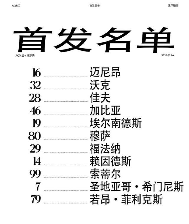AC米兰首发阵容: